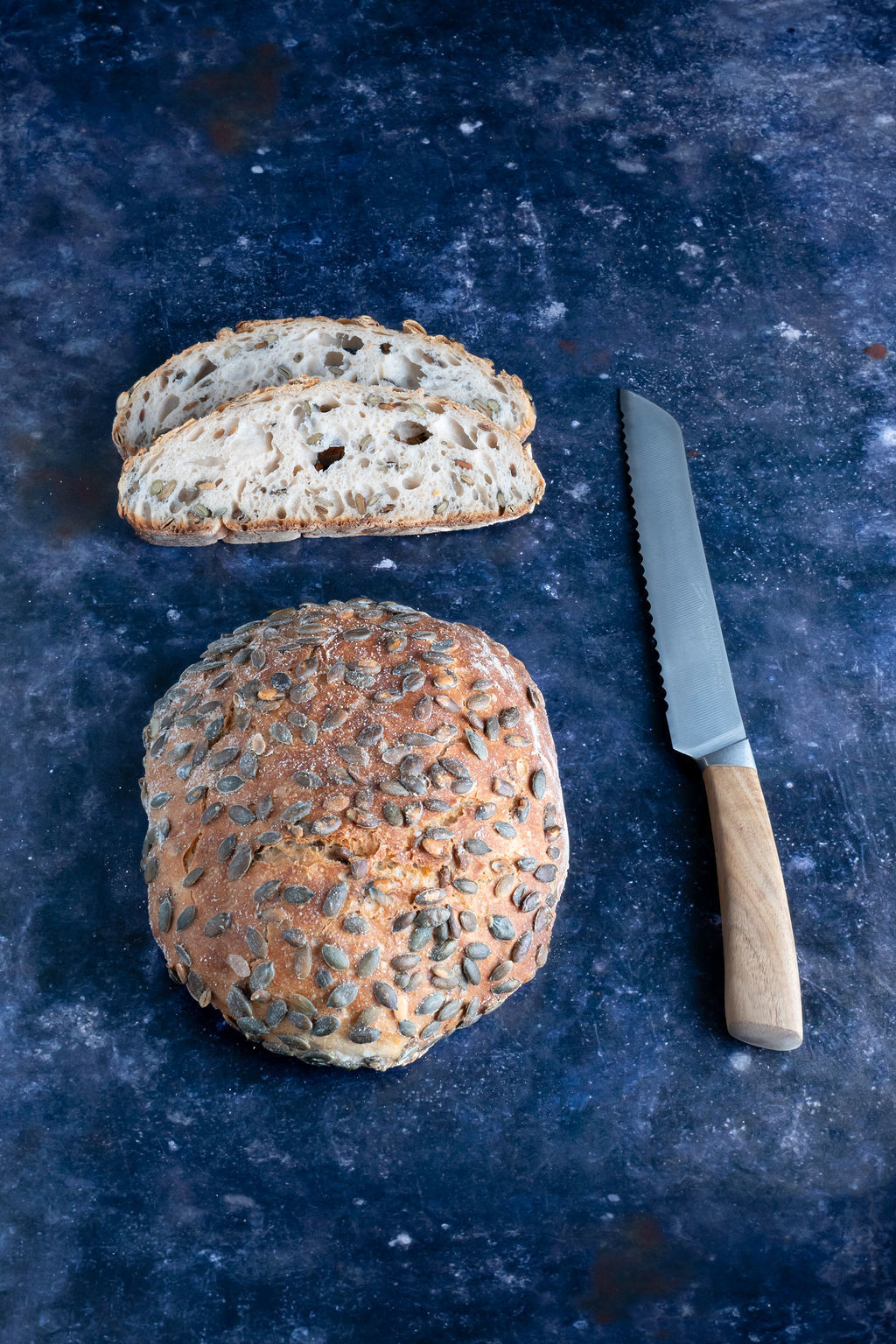 Ingr: wit tarwemeel T65 "Tradition" 90%, boekweitmeel 10%, zuurdesem, pompoenpitten, gejodeerd zout, verse gist (0,2%/kg meel)