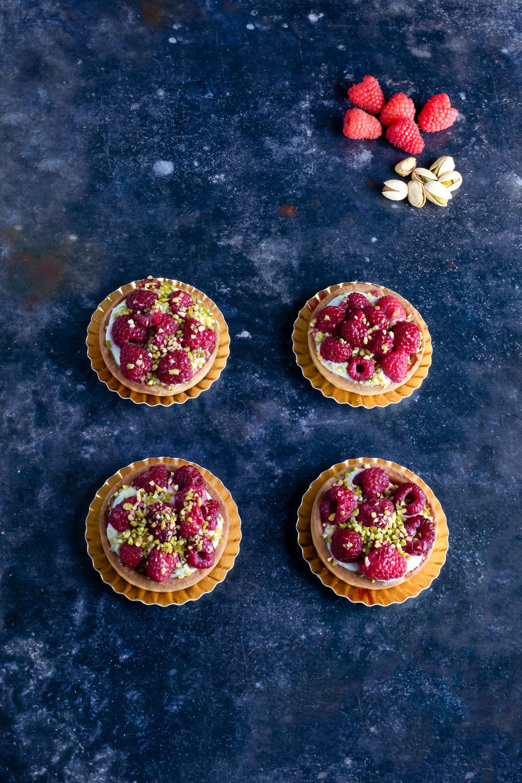 Ingr: tarwebloem, boter, suiker, zout, ei, amandel, melk, frambozen, pistaches, dierlijk gelatine
